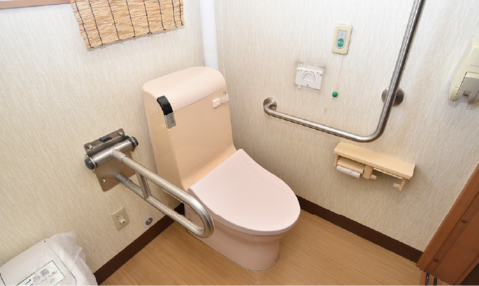 - 安全面に配慮されたバリアフリーの浴室で安全に入浴していただくことができます。排泄についても利用者様の状態に応じた援助を行います。また、職員が清掃・リネン交換等を行いますが、お手伝い頂ける方には一緒に行っていただいています。